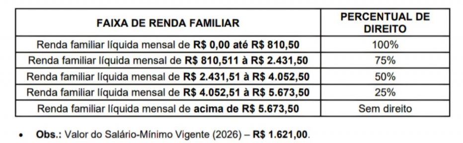 O valor repassado será uma porcentagem do que o estudante gasta com o transporte, sendo essa porcentagem determinada pela renda familiar líquida mensal: